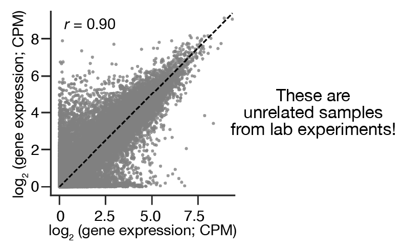 Meaningfully assessing high-level accuracy was surprisingly tricky. The transcriptomes of even unrelated biological samples are well correlated due to the strongly structured nature of gene expression: