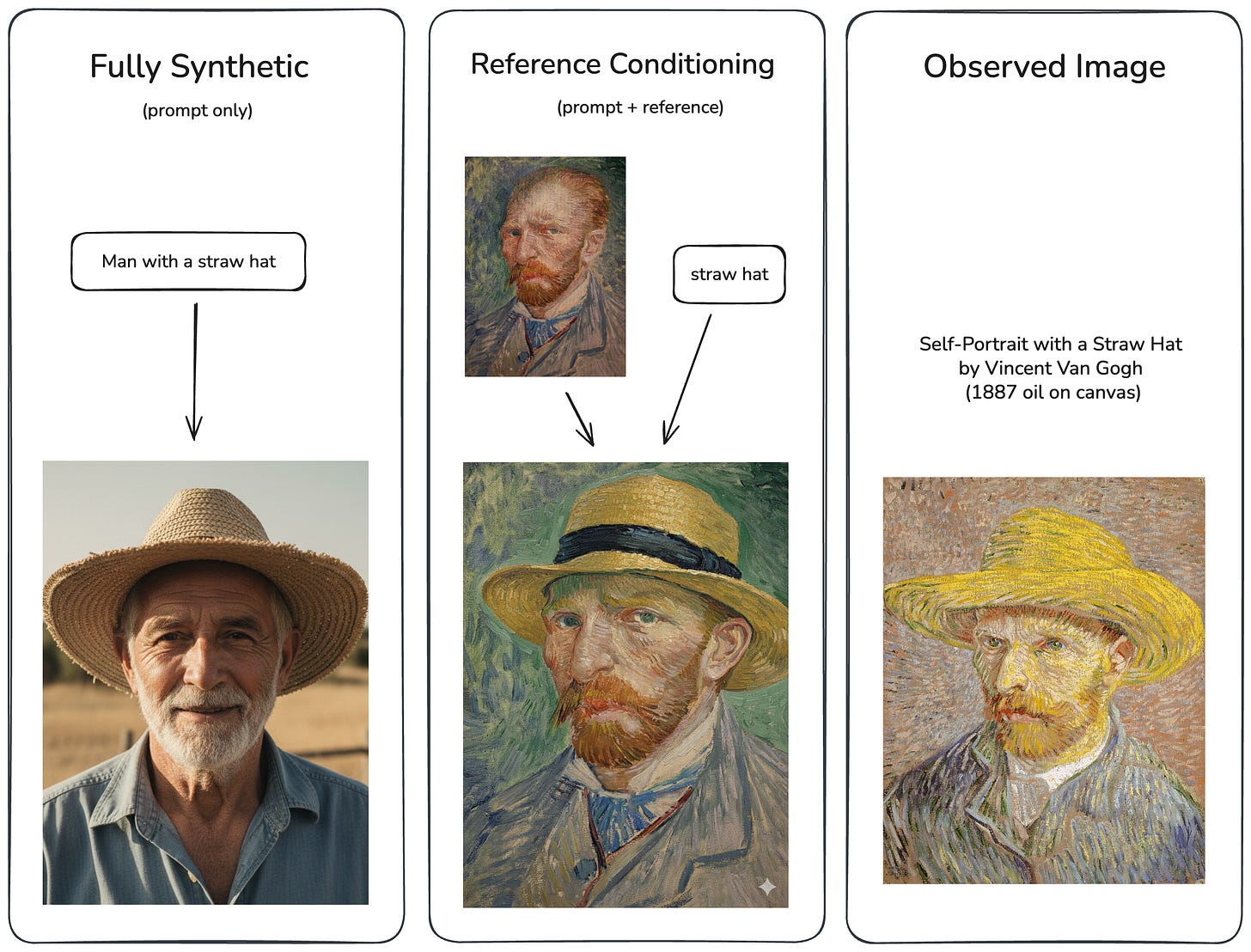 To understand reference conditioning, let’s start by exploring an analogous concept in image generation. Suppose you want to see how Vincent van Gogh might have painted a portrait of himself wearing a straw hat (which he actually did on multiple occasions)...