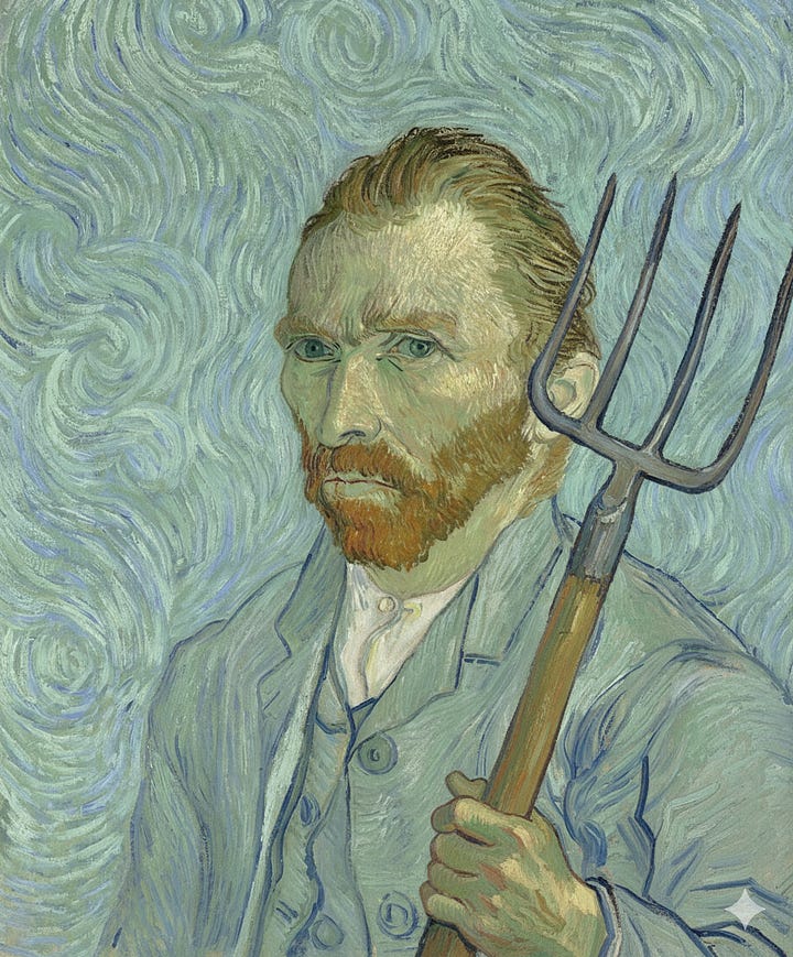 And that’s where things get interesting. Confident in our approach, we can now apply reference conditioning to examine things that don’t exist, but very well could. For example, we can create a realistic painting that Van Gogh never (as far as I know) created himself by prompting with the word “pitchfork” and a different self-portrait.